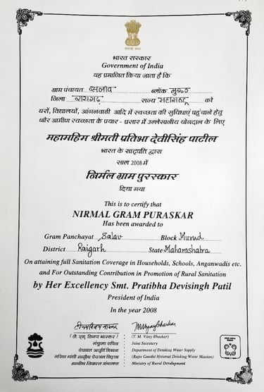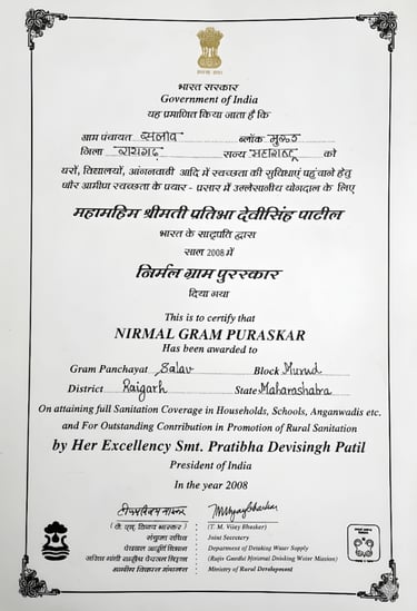 साळाव ग्रामपंचायतीने गेल्या काही वर्षांत केवळ विकासाची कामेच केली नाहीत, तर गुणवत्ता आणि पारदर्शकतेच्या जोरावर अनेक प्रतिष्ठित पुरस्कार मिळवून गावाची किर्ती वाढवली आहे. हे पुरस्कार म्हणजे गावातील प्रत्येक नागरिकाने दिलेल्या सहकार्याचा आणि आमच्या संपूर्ण टीमच्या अथक परिश्रमाचा सन्मान आहे. साळाव गावाला आदर्श ग्राम बनवण्याच्या आमच्या संकल्पाची ही पोचपावती आहे.
