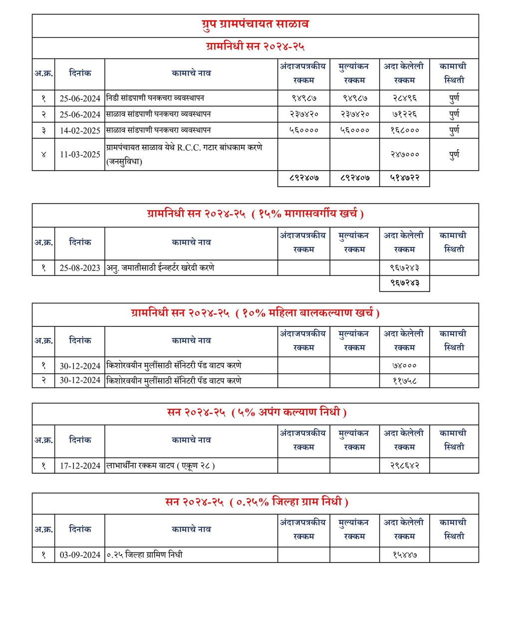 मागील तीन वर्षांत साळाव ग्रामपंचायतीने हाती घेतलेल्या विकास कामांचा सविस्तर लेखाजोखा या अहवालात सादर केला आहे. हा अहवाल साळाव गावातील प्रत्येक नागरिकाप्रती असलेल्या आमच्या पारदर्शकतेच्या आणि जबाबदारीच्या बांधिलकीचा पुरावा आहे. आमच्या सामूहिक प्रयत्नांतून साध्य झालेल्या प्रगतीचा आणि साळावच्या उज्वल भविष्यासाठी आखलेल्या पुढील दिशांचा हा प्रवास पाहण्यासाठी, कृपया खालील अहवाल वाचा.